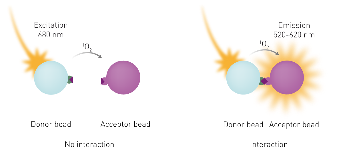 在结合实验中,一种结合伴侣(如受体)与供体珠连接,另一种结合伴侣(如配体)与受体珠连接。当受体与配体发生相互作用时,化学能量会在两种微珠之间转移,产生发光信号(图 1)。AlphaScreen 技术也可用于竞争实验或裂解检测实验,在这类实验中,检测到的信号强度会降低。