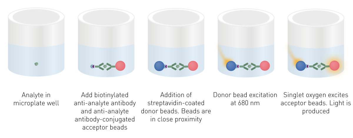 与传统酶联免疫吸附法(ELISA)相比,AlphaLISA 具有更高的灵敏度、更宽的动态范围和更稳定的性能和更短的检测时间。此外,由于无需洗涤步骤(见下文),AlphaLISA很容易适配自动化高通量筛选。