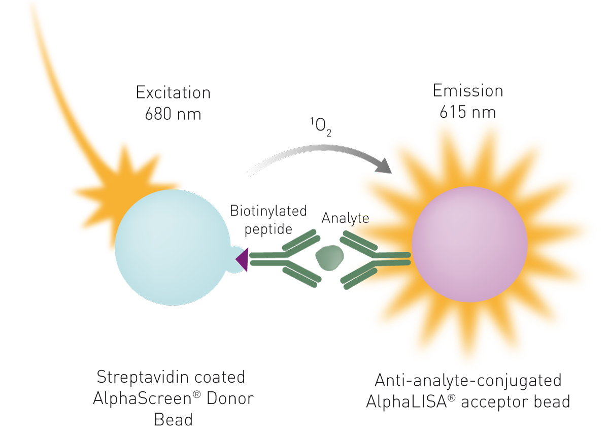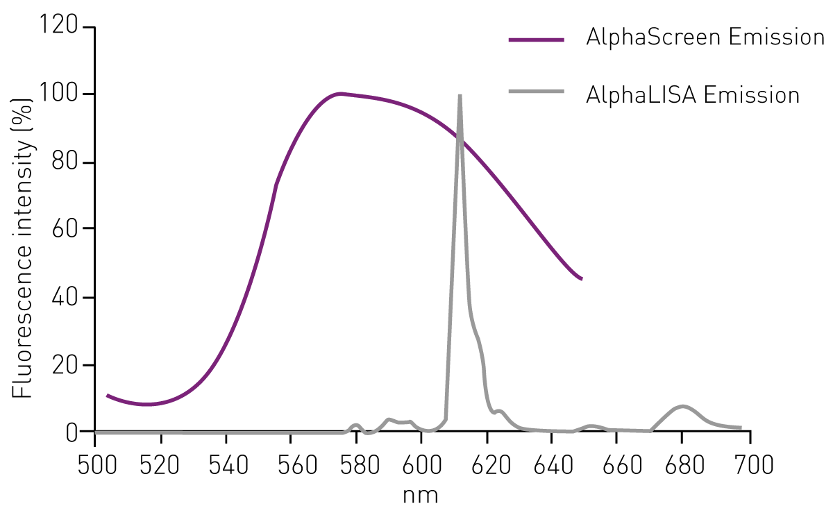 AlphaLISA 是 AlphaScreen 技术的进一步发展,它与 AlphaScreen 使用相同的供体珠,但采用不同类型的受体珠。在 AlphaLISA 受体珠中,蒽和红荧烯被铕螯合物(europium chelates)替代。受激发的铕会发射波长为 615 纳米的光,且其波长带宽远窄于 AlphaScreen(图 3)。因此,AlphaLISA 的发射信号不易受化合物干扰,可用于检测生物样品(如细胞培养上清液、细胞裂解液、血清和血浆)中的分析物。
