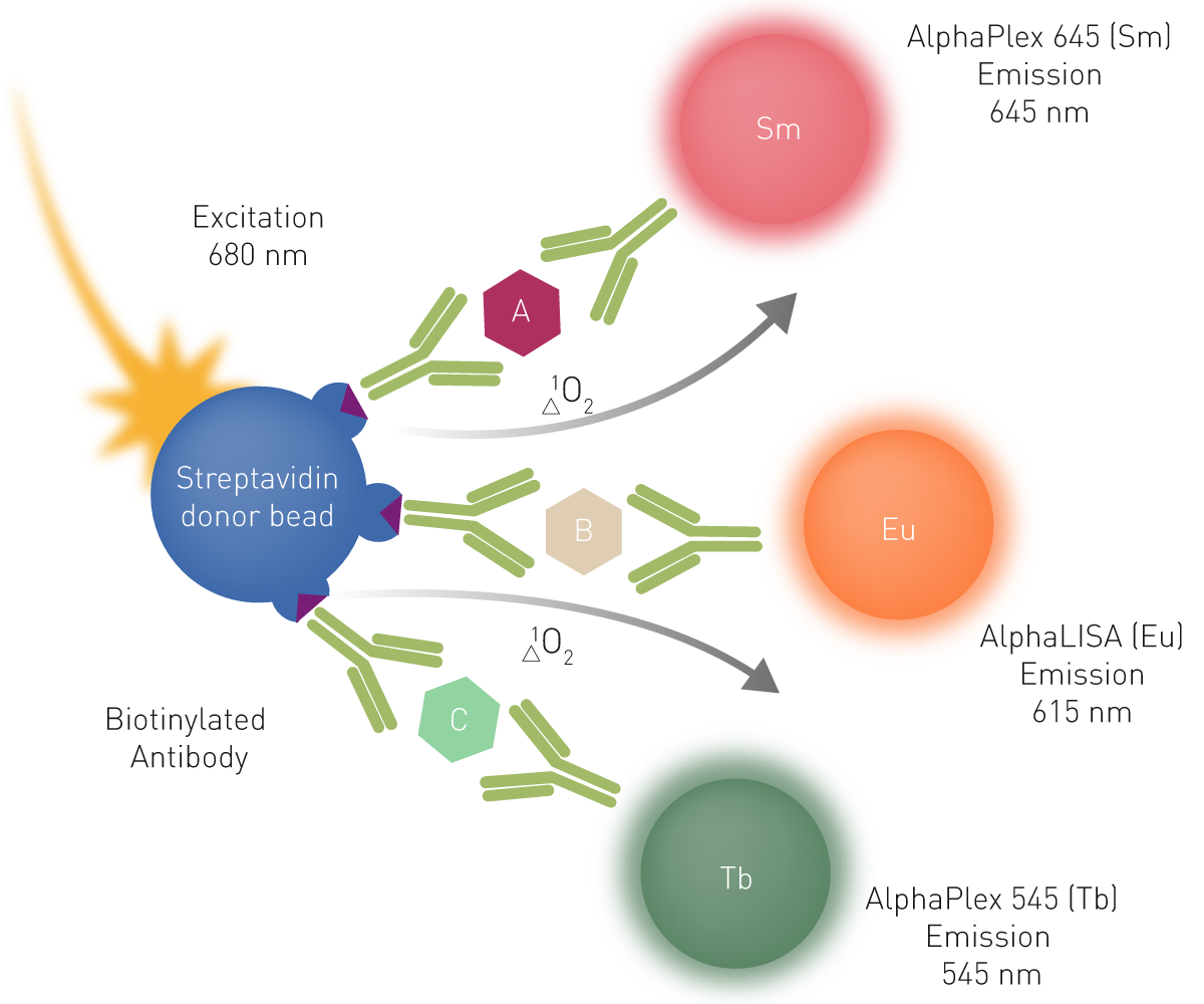 AlphaPlex 是 AlphaScreen 技术的另一项拓展,通过使用不同波长的受体珠,可在单个孔中对多达三种分析物进行定量。在这些受体珠中,蒽和红荧烯被铽螯合物(用于 AlphaPlex 545)或钐螯合物(用于 AlphaPlex 645)替代。生物素化抗分析物抗体与链霉亲和素供体珠结合,相应的抗分析物抗体则与 AlphaPlex 或 AlphaLISA 受体珠偶联。当存在目标分析物时,供体珠受激发并释放单线态氧,触发不同受体珠产生化学发光信号。