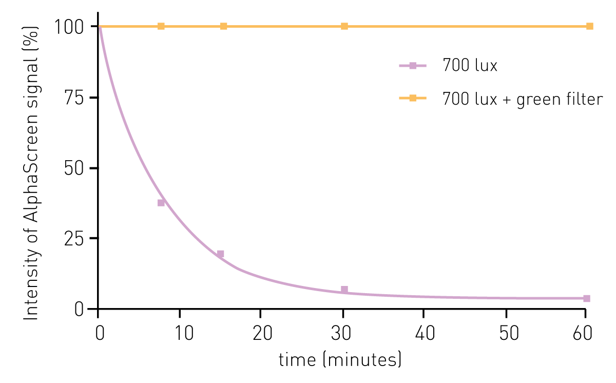 AlphaScreen 化学反应对光敏感,理想情况下应在弱光环境(低于 100 Lux)下准备和进行实验。若无法满足这一条件,可在密闭房间内安装绿色滤光照明 —— 工作区和 / 或酶标仪附近的灯具需覆盖绿色滤光片。研究表明,使用绿色滤光片的效果几乎与在暗处进行实验相当(图 7)。