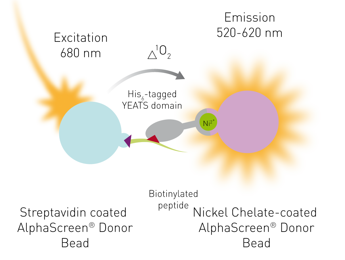 在应用说明《PHERAstar 通过 AlphaScreen 实验开发人源 YEATS 结构域选择性抑制剂》(PHERAstar measures AlphaScreen assay to develop selective inhibitors for the human YEATS domains)中,展示了一个基于 AlphaScreen 的相互作用实验案例。