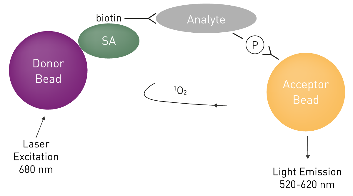 研究人员使用 AlphaScreen SureFire® ERK1/2 磷酸化实验检测细胞裂解液:这是一种夹心免疫测定,磷酸化细胞蛋白被 “与链霉亲和素包被供体珠结合的抗分析物抗体” 和 “与蛋白 A 偶联受体珠结合的抗磷酸化抗体” 夹在中间(图 9)。分析物的磷酸化会导致光信号增强,相关细节可参考应用说明《AlphaScreen SureFire 磷酸化 ERK1/2 实验》(An AlphaScreen SureFire Phospho-ERK1/2 assay)。