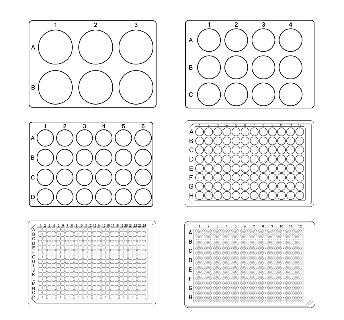 不同制造商生产的微孔板,在尺寸和孔位上可能存在细微差异,但所有微孔板的底座尺寸均保持一致。孔通常呈矩形矩阵排列,常见规格有 6 孔、12 孔、24 孔、48 孔、96 孔、384 孔和 1536 孔(见图 2)。此外,还有 3456 孔的规格,但并不常用。