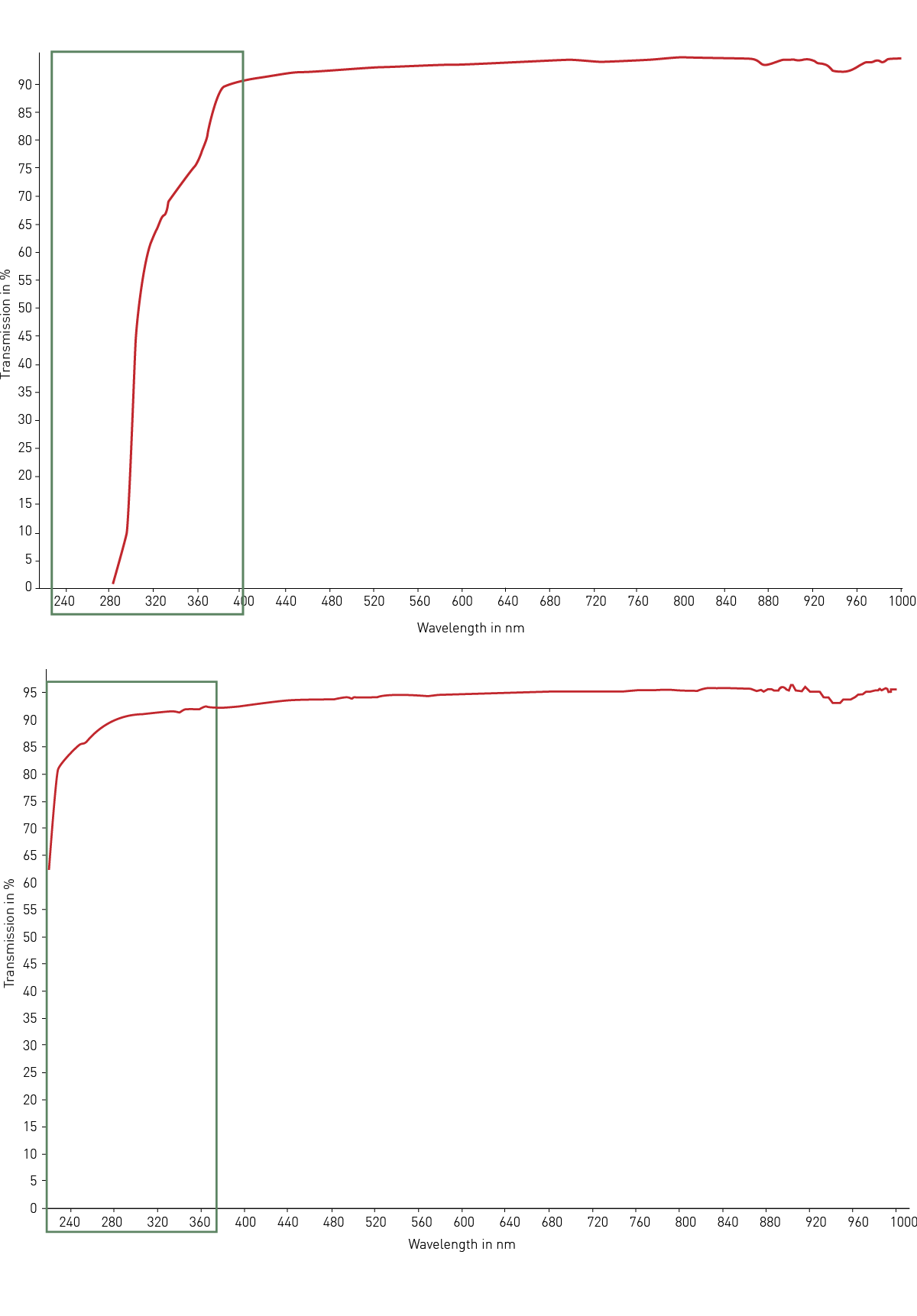 聚苯乙烯是塑料实验室器具中最常用的材质。其透明度高,经适当改性后,可用于光学检测、吸光度实验(如 ELISA)和显微镜观察。但聚苯乙烯无法透射紫外光(波长 < 320 纳米),因此不适用于RNA 和 DNA 定量分析。而环烯烃共聚物(COC)在 200-400 纳米波长范围内的紫外光透射率更高,且自发荧光低(见图 4),适合核酸定量场景。